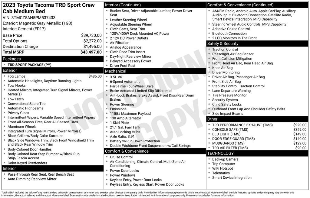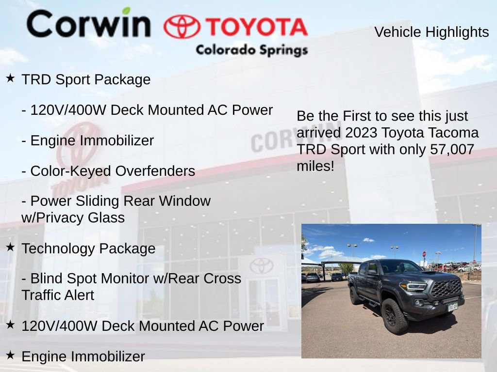 We invite you to experience the power and versatility of this remarkable vehicle for yourself. Visit our showroom today and let us put you behind the wheel of this impressive 2023 Toyota Tacoma TRD Sport V6. We're confident you'll be impressed by its performance, technology, and overall value. Don't miss your chance to make this Tacoma your own.