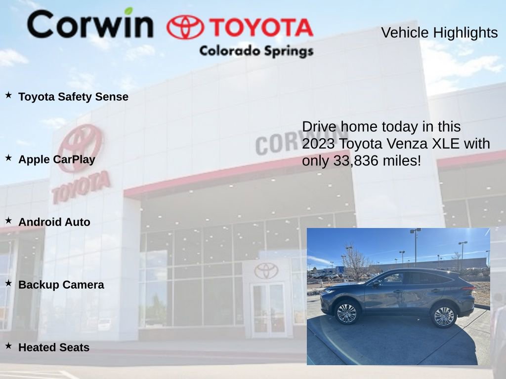 This Toyota Venza is well equipped and includes the following features and benefits, Toyota Safety Sense, Apple CarPlay, Android Auto, Backup Camera, Heated Seats. Odometer is 4885 miles below market average! 40/37 City/Highway MPG