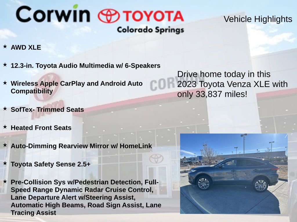 This Toyota Venza is well equipped and includes the following features and benefits, AWD XLE, 12.3-in. Toyota Audio Multimedia w/ 6-Speakers, Wireless Apple CarPlay and Android Auto Compatibility, SofTex- Trimmed Seats, Heated Front Seats, Auto-Dimming Rearview Mirror w/ HomeLink, Toyota Safety Sense 2.5+, Pre-Collision Sys w/Pedestrian Detection, Full-Speed Range Dynamic Radar Cruise Control, Lane Departure Alert w/Steering Assist, Automatic High Beams, Road Sign Assist, Lane Tracing Assist, ABS brakes, Active Cruise Control, Alloy wheels, Electronic Stability Control, Front dual zone A/C, Heated Front Bucket Seats, Heated front seats, Illuminated entry, Low tire pressure warning, Power Liftgate, Remote keyless entry, Traction control. Odometer is 2287 miles below market average! 40/37 City/Highway MPG