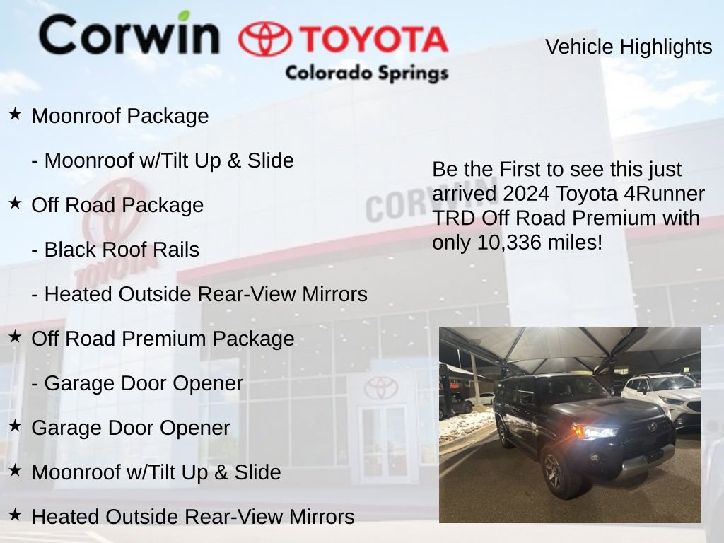 This Toyota 4Runner is well equipped and includes the following features and benefits, Black Roof Rails, Garage Door Opener, Heated Outside Rear-View Mirrors, Moonroof Package, Moonroof w/Tilt Up & Slide, Off Road Package, Off Road Premium Package.