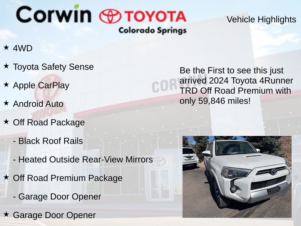 Experience the thrill of the open road and the freedom of the great outdoors with the 2024 Toyota 4Runner TRD Off-Road Premium. Visit our showroom today and let us demonstrate how this remarkable SUV can enhance your driving experience.