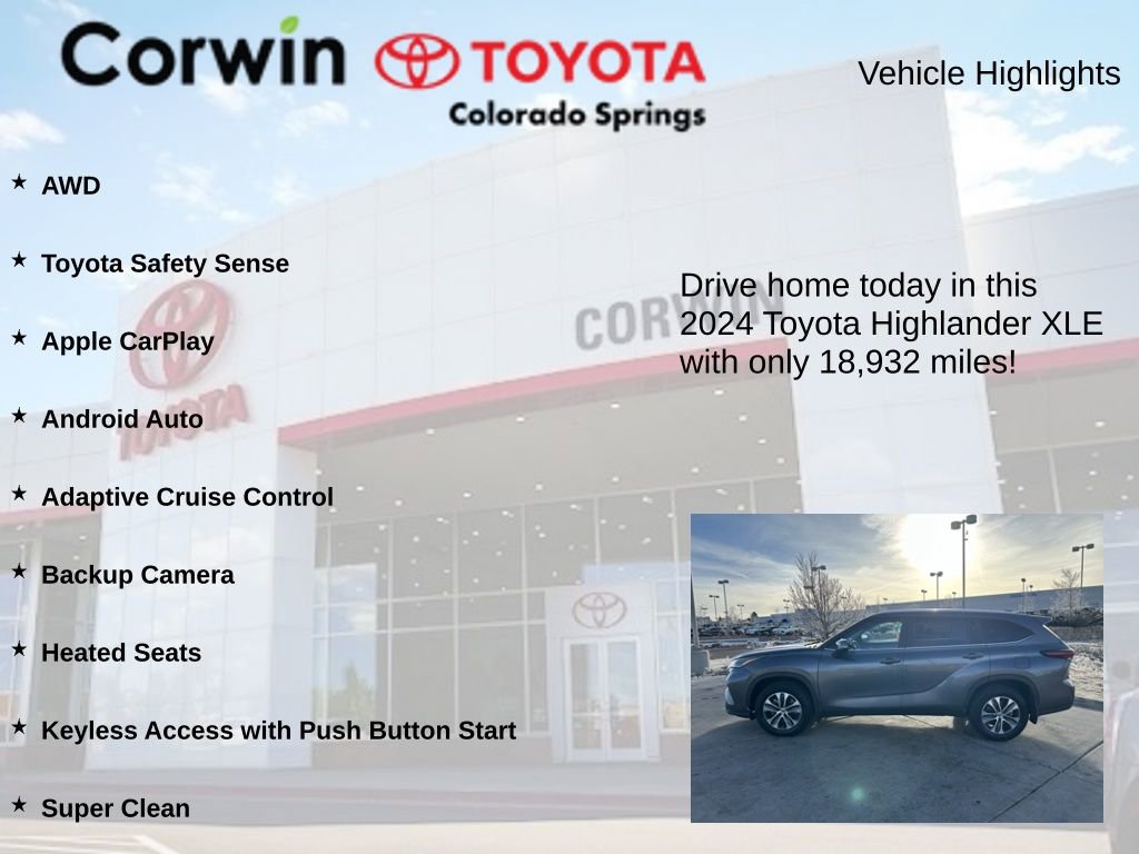 Elevate your driving experience with this exceptional 2024 Toyota Highlander XLE. Boasting a powerful 2.4L turbocharged engine, advanced all-wheel-drive capabilities, and a host of premium features, this SUV is poised to exceed your expectations.