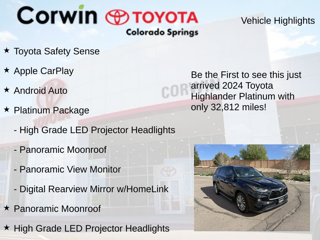 This exceptional Highlander Platinum is more than just a vehicle it's a gateway to a refined and elevated driving experience. Visit our showroom today to witness its unparalleled capabilities and luxurious features firsthand. We're confident that once you take it for a test drive, you'll be captivated by its exceptional performance, cutting-edge technology, and uncompromising comfort. Let us help you discover the true joy of driving with this remarkable 2024 Toyota Highlander Platinum.