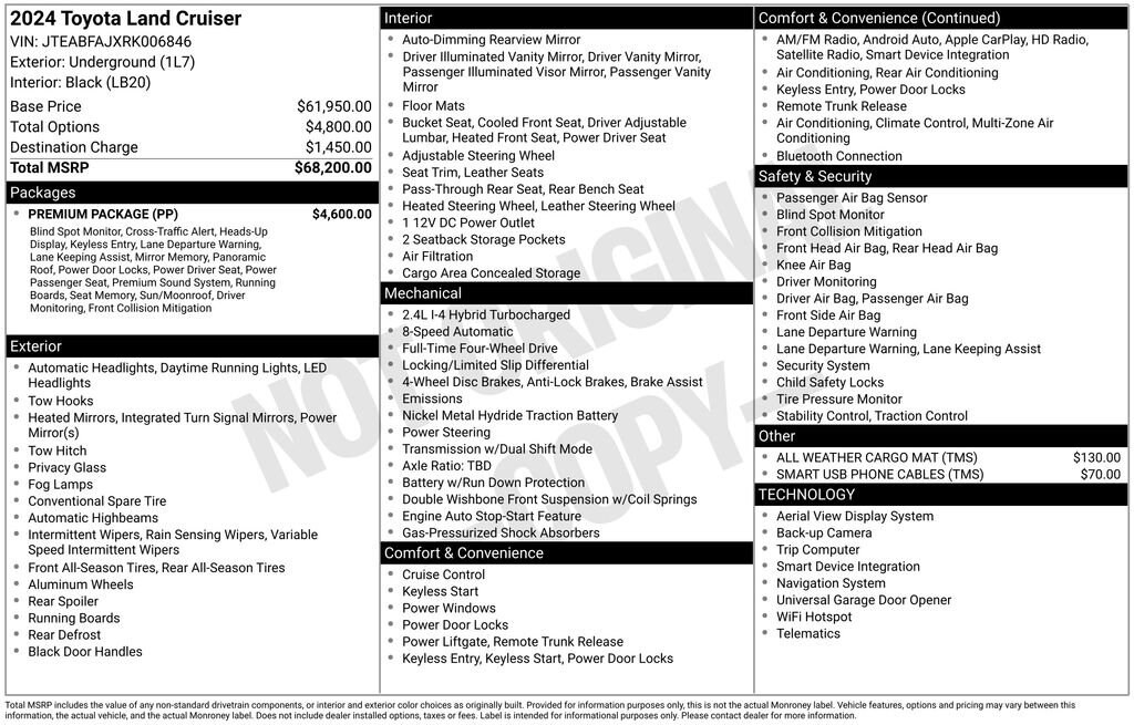 - Premium Package: Includes Pre-Collision System, Sunroof & Moonroof, 14-Speaker JBL Premium Sound System, Interior Rear View Mirror, Side Step & Step Cover, Front Cross Traffic Alert, 8-Way Power Seats, driver seat with memory, Lane Keeping System, Head-Up Display (HUD), Blind Spot Monitor with Lane Change Assist, Entry Digital Key, Wireless Charger