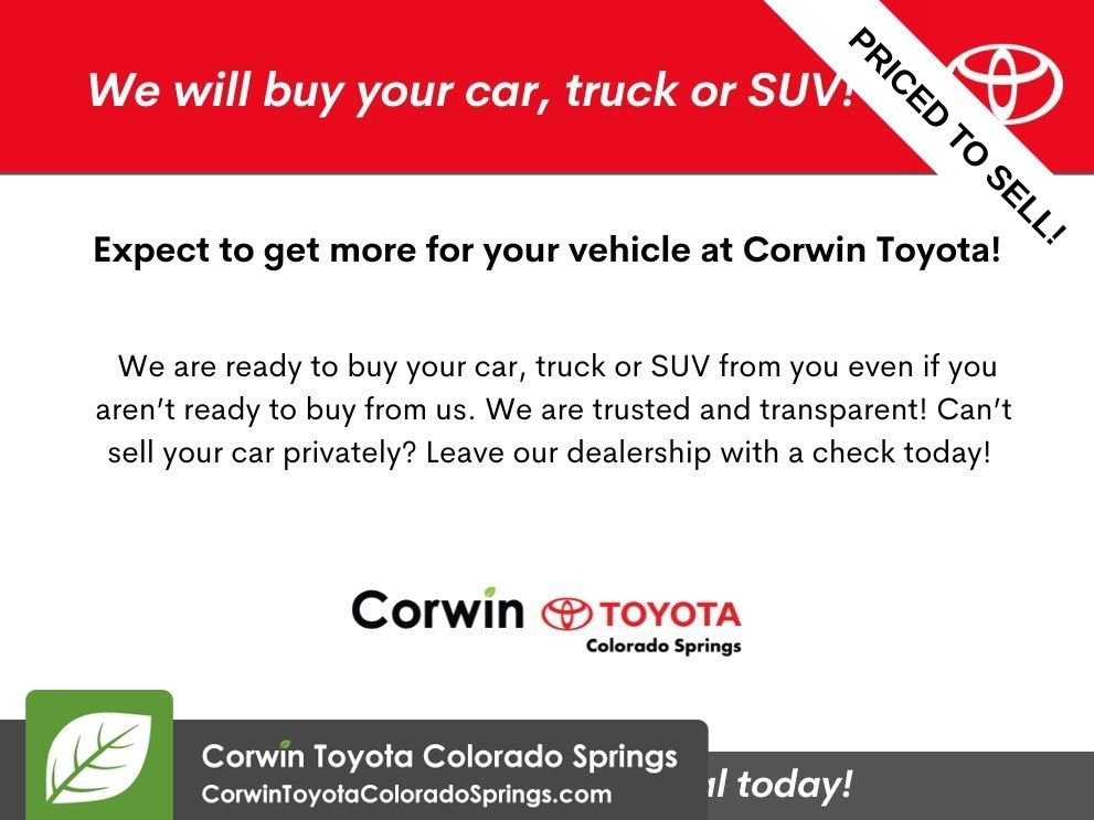 Friendly service, a huge selection of new Toyota vehicles, and fast flexible financing options are a few of the reasons why we are the new and pre-owned vehicle leaders in the greater Colorado Springs Area. Call us or stop in and see us today at Corwin Toyota Colorado Springs! Located at 5115 New Car Dr. Colorado Springs, CO 80923. (719) 598-2222 or visit us online at CorwinToyotaColoradoSprings.com. All prices must be verified with the dealer.
