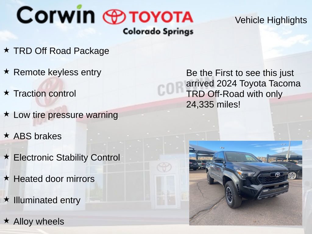 This Toyota Tacoma is well equipped and includes the following features and benefits, ABS brakes, Alloy wheels, Electronic Stability Control, Heated door mirrors, Illuminated entry, Low tire pressure warning, Remote keyless entry, Traction control, TRD Off Road Package.