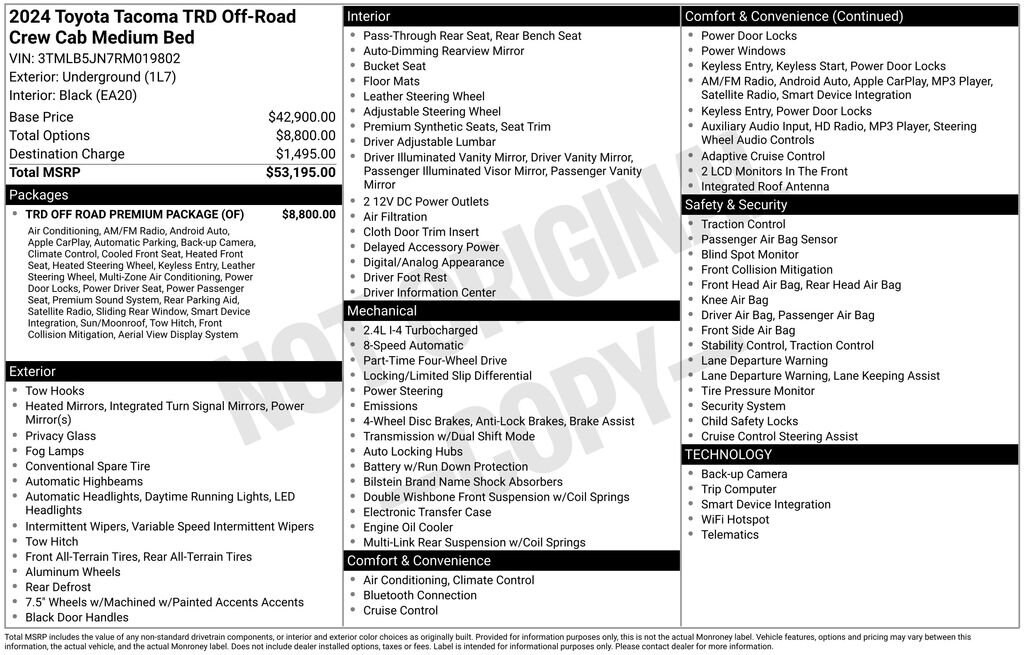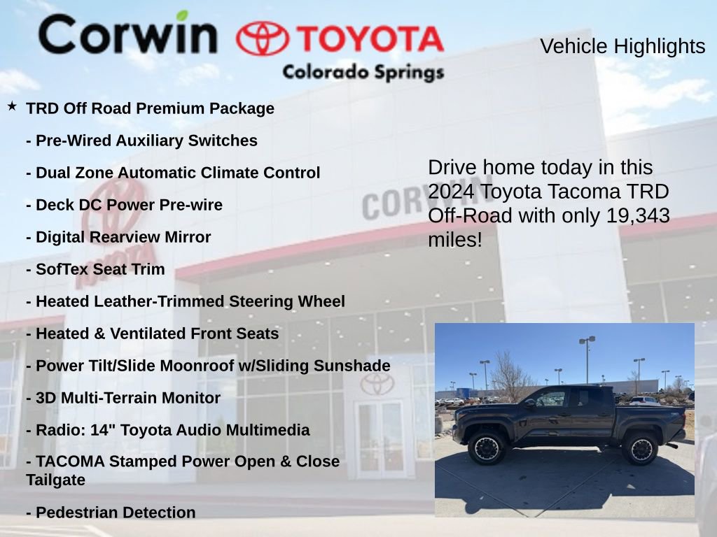 - TRD OFF ROAD PREMIUM PACKAGE: Includes 3D Multi-Terrain Monitor, Power Tilt/Slide Moonroof, TACOMA Stamped Power Open & Close Tailgate, Digital Rearview Mirror, Towing Technology Package, Heated & Ventilated Front Seats, Qi-Compatible Wireless Charging, and more.