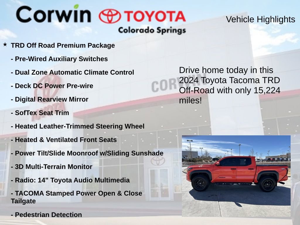 Whether you're tackling rugged off-road trails or navigating the city streets, this 2024 Toyota Tacoma TRD Off-Road is the ultimate companion. Experience the perfect blend of capability, technology, and comfort schedule a test drive today and discover the difference for yourself.