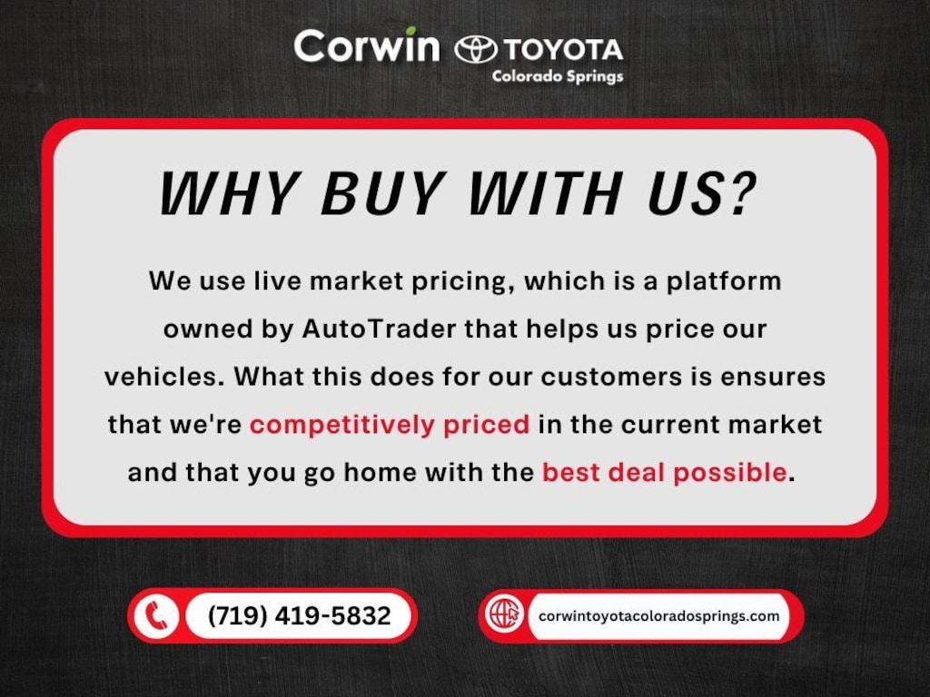 Friendly service, a huge selection of new Toyota vehicles, and fast flexible financing options are a few of the reasons why we are the new and pre-owned vehicle leaders in the greater Colorado Springs Area. Call us or stop in and see us today at Corwin Toyota Colorado Springs! Located at 5115 New Car Dr. Colorado Springs, CO 80923. (719) 598-2222 or visit us online at CorwinToyotaColoradoSprings.com. All prices must be verified with the dealer.