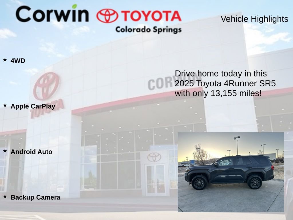 Elevate your driving experience with this exceptional 2025 Toyota 4Runner SR5. Boasting a sleek Underground exterior and a powerful 2.4L 4-Cylinder engine paired with an 8-Speed Automatic transmission, this 4WD SUV is ready to conquer any terrain with exceptional efficiency, delivering an impressive 19 city and 25 highway MPG.