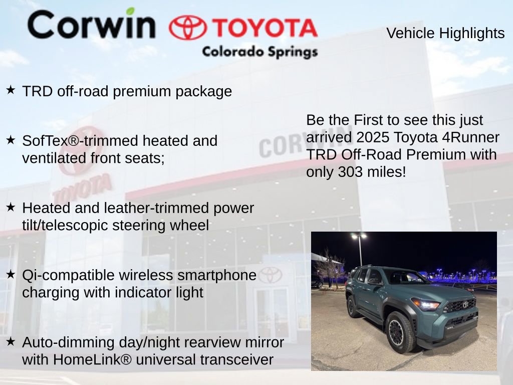 This Toyota 4Runner is well equipped and includes the following features and benefits, TRD off-road premium package, SofTex®-trimmed heated and ventilated front seats;, Heated and leather-trimmed power tilt/telescopic steering wheel, Qi-compatible wireless smartphone charging with indicator light, Auto-dimming day/night rearview mirror with HomeLink® universal transceiver, 14-in. Audio Multimedia Display with 14-speaker JBL® Premium Audio system including JBL® FLEX portable Bluetooth® speaker.