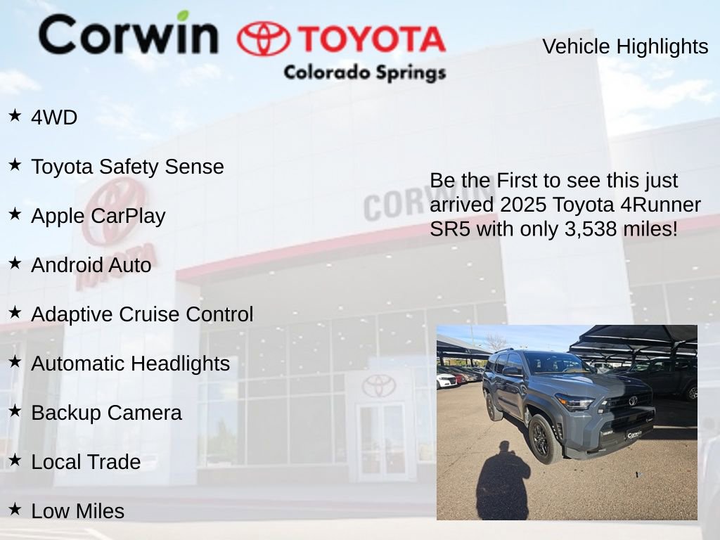 This Toyota 4Runner is well equipped and includes the following features and benefits, 4WD, Toyota Safety Sense, Apple CarPlay, Android Auto, Adaptive Cruise Control, Automatic Headlights, Backup Camera, Local Trade, Low Miles. Odometer is 10907 miles below market average!