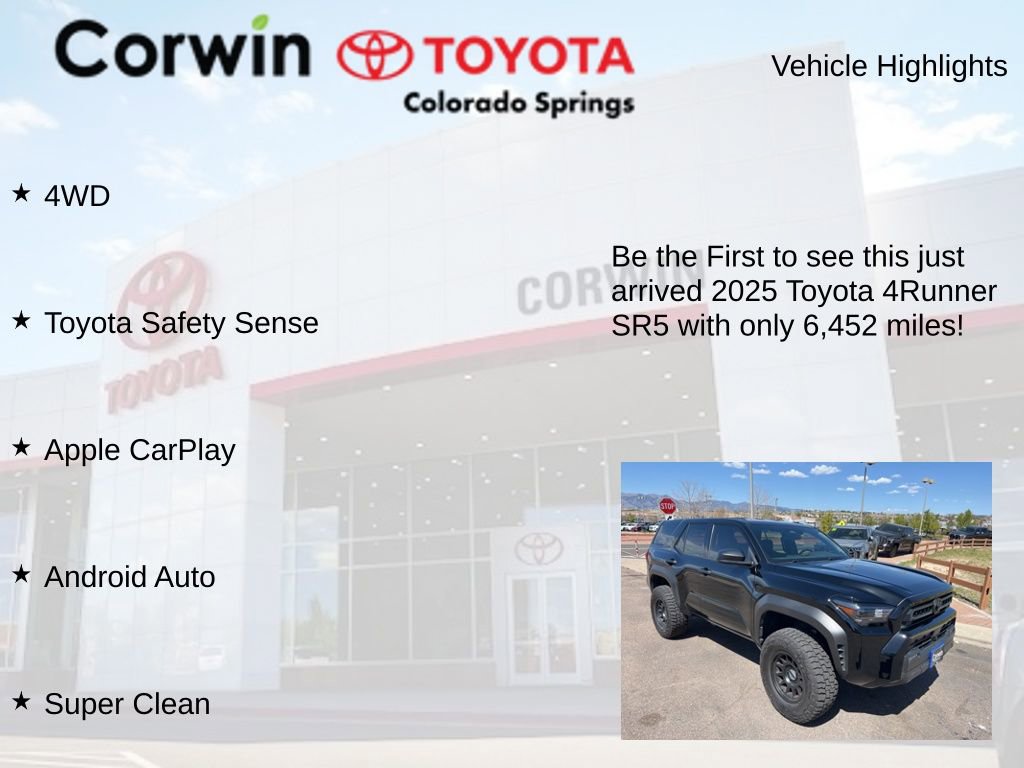 With just 6,452 miles on the odometer, this 2025 Toyota 4Runner SR5 is in exceptional condition, both inside and out. It's a true testament to Toyota's renowned quality and reliability, making it an excellent choice for those seeking a capable and versatile SUV.