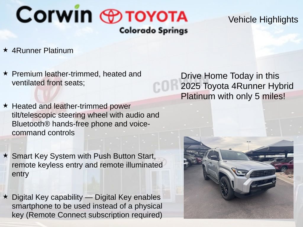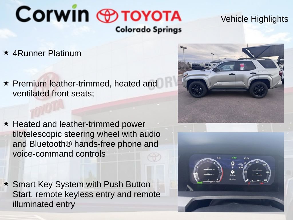 This Toyota 4Runner i-FORCE MAX Hybrid is well equipped and includes the following features and benefits, 4Runner Platinum, Premium leather-trimmed, heated and ventilated front seats;, Heated and leather-trimmed power tilt/telescopic steering wheel with audio and Bluetooth® hands-free phone and voice-command controls, Smart Key System with Push Button Start, remote keyless entry and remote illuminated entry, Digital Key capability Digital Key enables smartphone to be used instead of a physical key (Remote Connect subscription required), Qi-compatible wireless smartphone charging with indicator light.