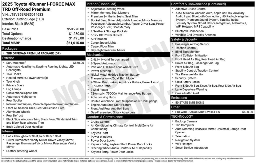 This Toyota 4Runner i-FORCE MAX Hybrid is well equipped and includes the following features and benefits, Sunroof/Moonroof, TRD Off Road Base, TRD Offroad Premium Package. Odometer is 4273 miles below market average!