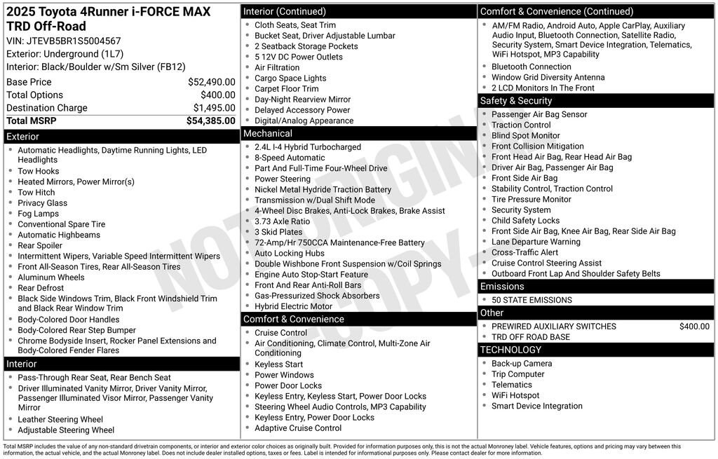 This Toyota 4Runner i-FORCE MAX Hybrid is well equipped and includes the following features and benefits, 4WD, Toyota Safety Sense, Apple CarPlay, Android Auto, Backup Camera, Collision Avoidance System, Keyless Access with Push Button Start, Low Miles, Steering Wheel Mounted Controls, Super Clean, Active Parking Assist, ABS brakes, Active Cruise Control, Alloy wheels, Electronic Stability Control, Front dual zone A/C, Heated door mirrors, Heated Front Bucket Seats, Illuminated entry, Low tire pressure warning, Remote keyless entry, Traction control, TRD Off Road Base.