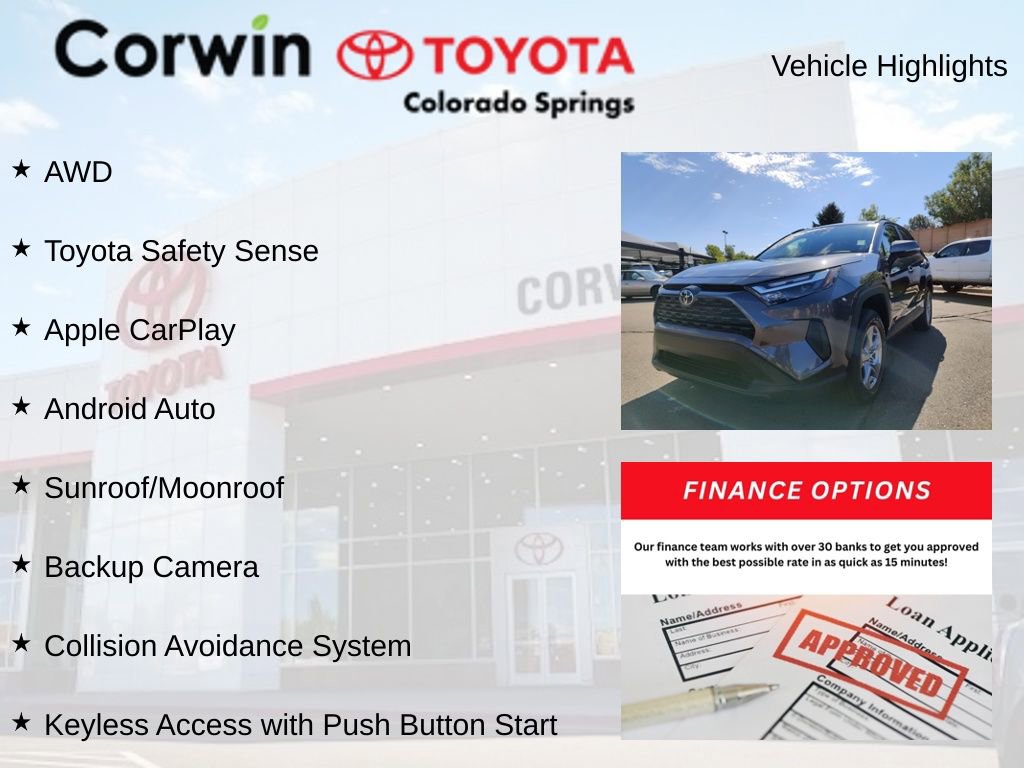 The RAV4 Hybrid XLE is packed with a wealth of premium features that elevate your driving experience. Enjoy the convenience of the Front Door Smart Key System with Push Button Start, the Tilt & Slide Moon Roof, and the Exterior Parking Camera Rear. Stay connected with the AM/FM/XM Audio System, while the Front Dual Zone A/C and Steering Wheel Mounted Audio Controls provide exceptional comfort and control.