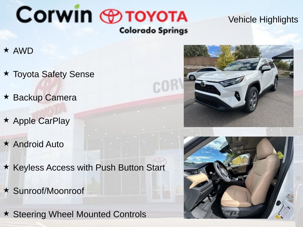 This Toyota RAV4 Hybrid is well equipped and includes the following features and benefits, AWD, Toyota Safety Sense, Apple CarPlay, Android Auto, Sunroof/Moonroof, Backup Camera, Keyless Access with Push Button Start, Steering Wheel Mounted Controls, Super Clean, Convenience Package, Front Door Smart Key System w/Push Button Start, Tilt & Slide Moon Roof. Odometer is 16938 miles below market average! 41/38 City/Highway MPG