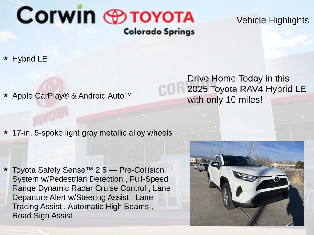 This Toyota RAV4 Hybrid is well equipped and includes the following features and benefits, Hybrid LE, Apple CarPlay® & Android AutoTM, 17-in. 5-spoke light gray metallic alloy wheels, Toyota Safety SenseTM 2.5 Pre-Collision System w/Pedestrian Detection , Full-Speed Range Dynamic Radar Cruise Control , Lane Departure Alert w/Steering Assist , Lane Tracing Assist , Automatic High Beams , Road Sign Assist. Odometer is 19585 miles below market average! 41/38 City/Highway MPG