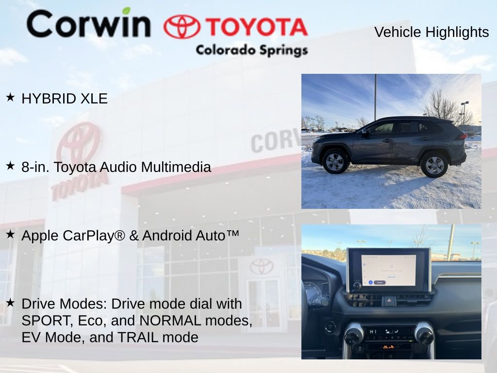 This Toyota RAV4 Hybrid is well equipped and includes the following features and benefits, HYBRID XLE, 8-in. Toyota Audio Multimedia, Apple CarPlay® & Android AutoTM, Drive Modes: Drive mode dial with SPORT, Eco, and NORMAL modes, EV Mode, and TRAIL mode, Toyota Safety SenseTM 2.5 Pre-Collision System w/Pedestrian Detection , Full-Speed Range Dynamic Radar Cruise Control , Lane Departure Alert w/Steering Assist , Lane Tracing Assist , Automatic High Beams , Road Sign Assist. 41/38 City/Highway MPG