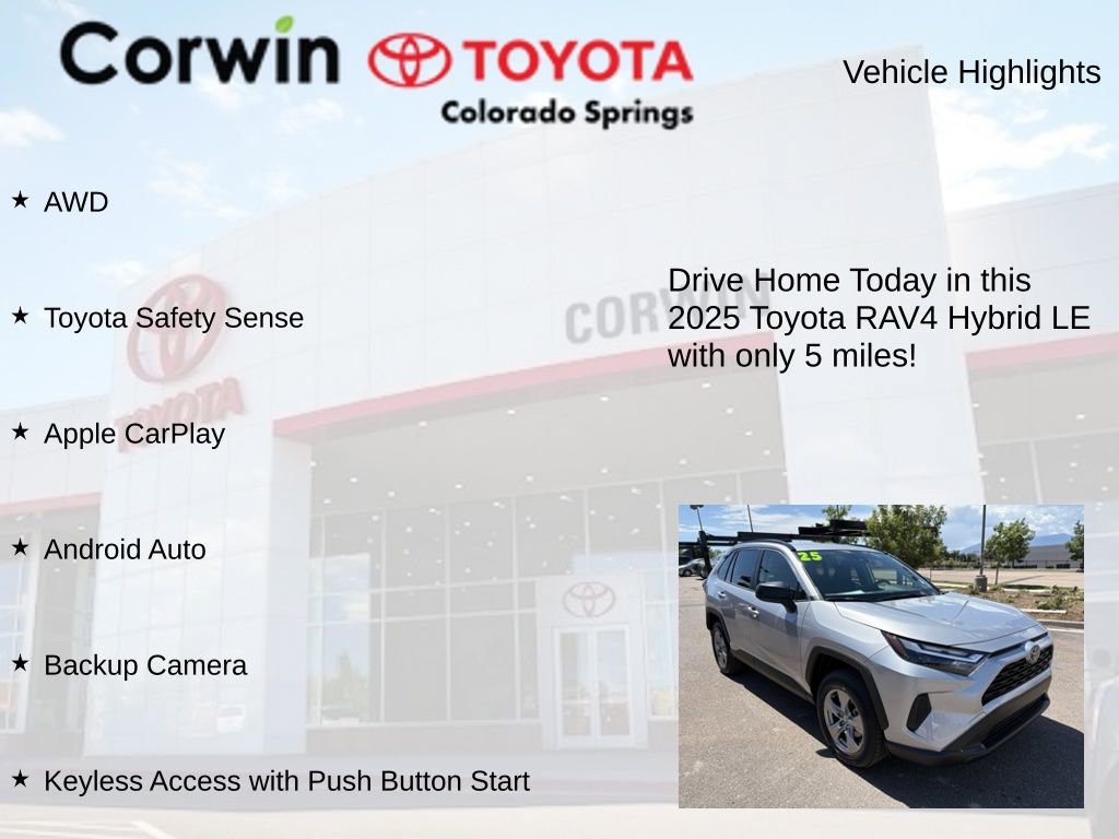 This Toyota RAV4 Hybrid is well equipped and includes the following features and benefits, AWD, Toyota Safety Sense, Apple CarPlay, Android Auto, Backup Camera, Keyless Access with Push Button Start. Odometer is 20629 miles below market average! 41/38 City/Highway MPG