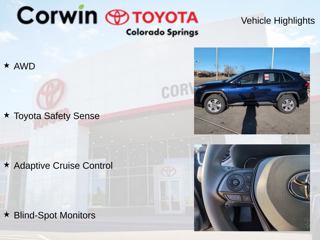 This Toyota RAV4 Hybrid is well equipped and includes the following features and benefits, AWD, Toyota Safety Sense, Adaptive Cruise Control, Blind-Spot Monitors. 41/38 City/Highway MPG