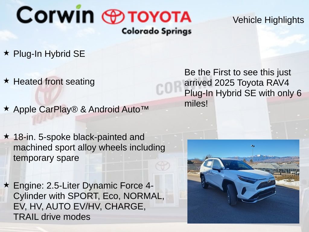 This Toyota RAV4 Plug-In Hybrid is well equipped and includes the following features and benefits, Plug-In Hybrid SE, Heated front seating, Apple CarPlay® & Android AutoTM, 18-in. 5-spoke black-painted and machined sport alloy wheels including temporary spare, Engine: 2.5-Liter Dynamic Force 4-Cylinder with SPORT, Eco, NORMAL, EV, HV, AUTO EV/HV, CHARGE, TRAIL drive modes.