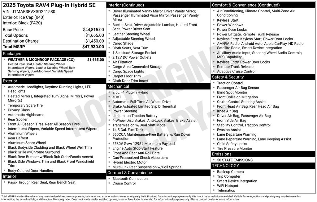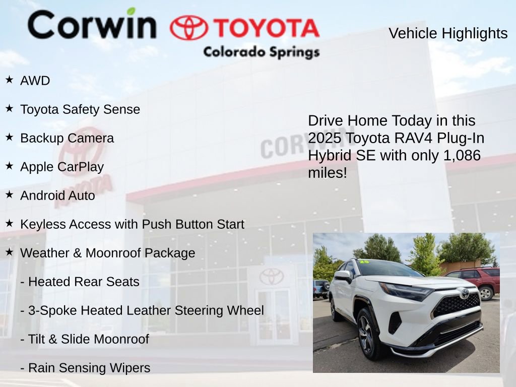 This Toyota RAV4 Plug-In Hybrid is well equipped and includes the following features and benefits, AWD, Toyota Safety Sense, Apple CarPlay, Android Auto, Backup Camera, Keyless Access with Push Button Start, 3-Spoke Heated Leather Steering Wheel, Heated Rear Seats, Rain Sensing Wipers, Tilt & Slide Moonroof, Weather & Moonroof Package. Odometer is 4361 miles below market average!
