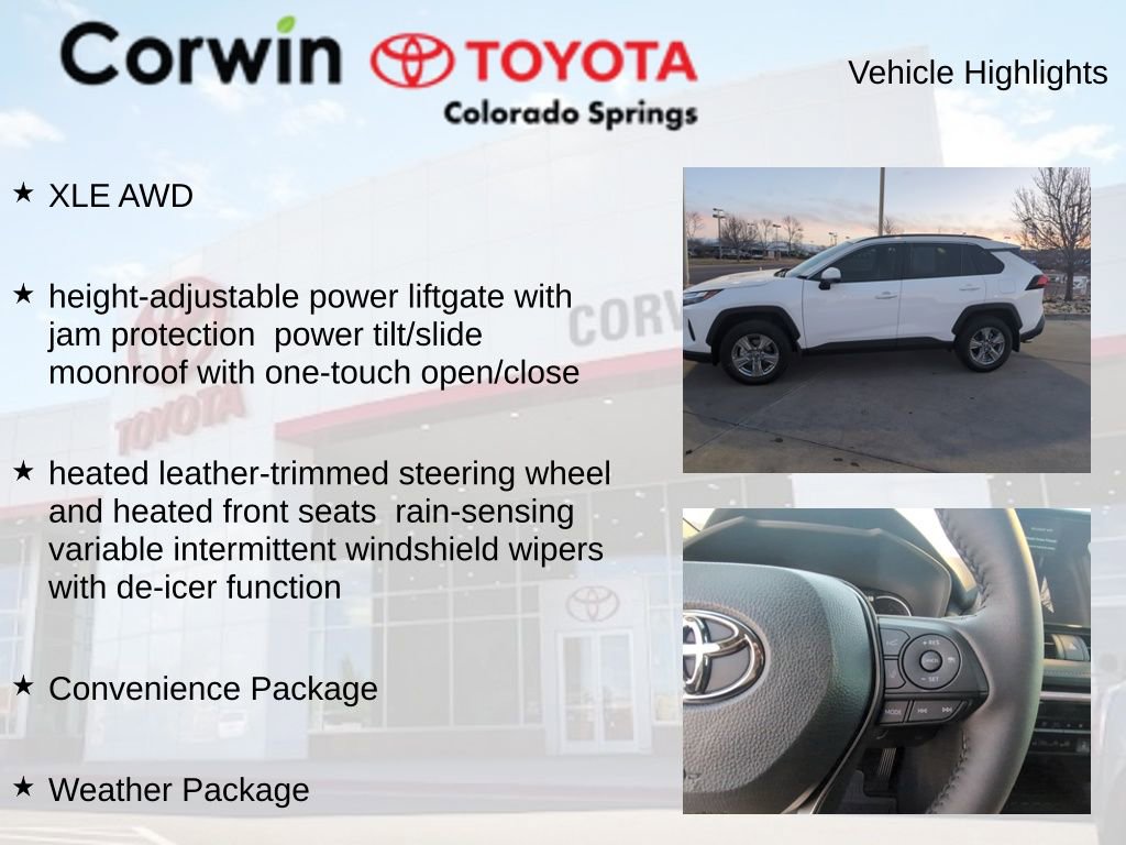 This Toyota RAV4 is well equipped and includes the following features and benefits, XLE AWD, height-adjustable power liftgate with jam protection power tilt/slide moonroof with one-touch open/close, heated leather-trimmed steering wheel and heated front seats rain-sensing variable intermittent windshield wipers with de-icer function, 3 Spoke Leather Heated Steering Wheel, Convenience Package, Front Door Smart Key System w/Push Button Start, Front Seat Heating, Tilt & Slide Moon Roof, Weather Package. Odometer is 19432 miles below market average! 27/33 City/Highway MPG