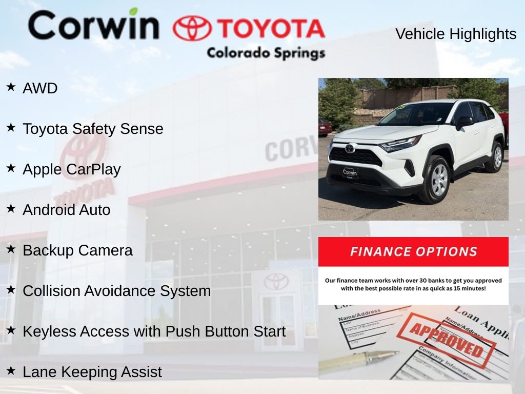 This Toyota RAV4 is well equipped and includes the following features and benefits, AWD, Toyota Safety Sense, Apple CarPlay, Android Auto, Backup Camera, Collision Avoidance System, Keyless Access with Push Button Start, Lane Keeping Assist, Steering Wheel Mounted Controls, Active Parking Assist, 17" Steel Wheels, Exterior Parking Camera Rear, Radio: AM/FM/XM Audio System, Remote keyless entry, Steering wheel mounted audio controls. Odometer is 13394 miles below market average! 27/34 City/Highway MPG