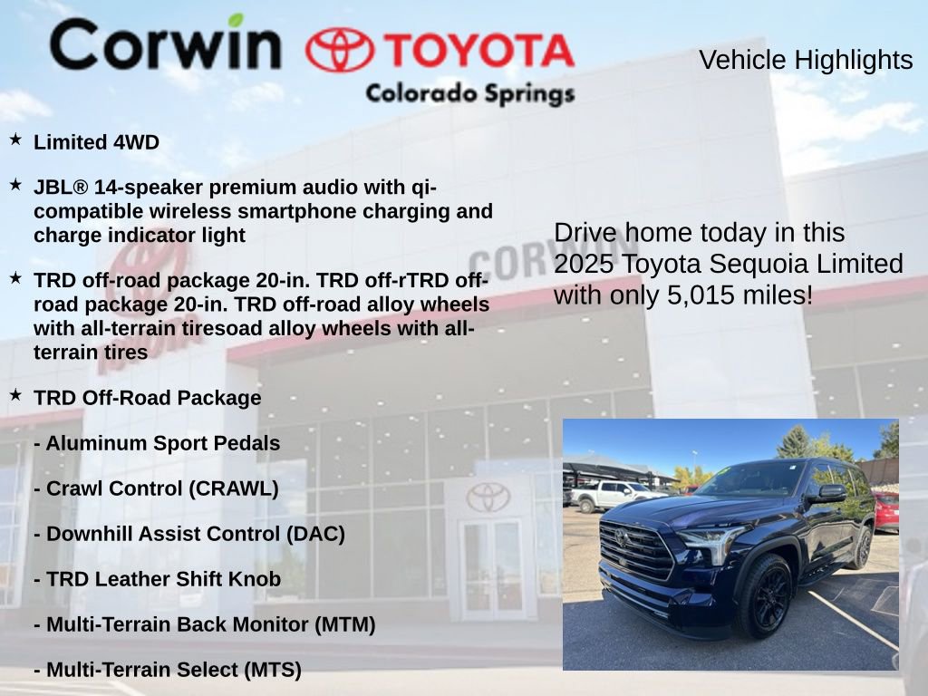 This Toyota Sequoia is well equipped and includes the following features and benefits, Limited 4WD, JBL® 14-speaker premium audio with qi-compatible wireless smartphone charging and charge indicator light, TRD off-road package 20-in. TRD off-rTRD off-road package 20-in. TRD off-road alloy wheels with all-terrain tiresoad alloy wheels with all-terrain tires, ABS brakes, Alloy wheels, Aluminum Sport Pedals, Aluminum Step & Step Cover, Crawl Control (CRAWL), Downhill Assist Control (DAC), Electronic Stability Control, Electronically-Controlled Locking Rr Differential, Front dual zone A/C, Heated & Ventilated Front Seats, Heated door mirrors, Heated front seats, Illuminated entry, Low tire pressure warning, Multi-Terrain Back Monitor (MTM), Multi-Terrain Select (MTS), Off-Road Suspension w/Bilstein Shocks, Power Liftgate, Power moonroof, Red Front-Axle Drive Shafts, Remote keyless entry, Traction control, TRD Leather Shift Knob, TRD OFF-ROAD Badging, TRD Off-Road Package, Wheels: 20" Black TRD Alloy. Odometer is 2180 miles below market average!