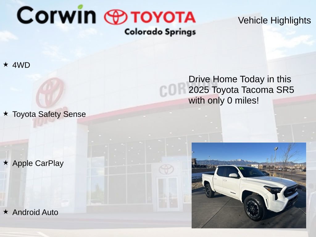 Discover the exceptional 2025 Toyota Tacoma SR5 a rugged and capable truck that's ready to elevate your driving experience. With its impressive 4WD capabilities, advanced safety features, and cutting-edge technology, this Tacoma is the perfect companion for your adventures, whether you're tackling the great outdoors or navigating the urban landscape.
