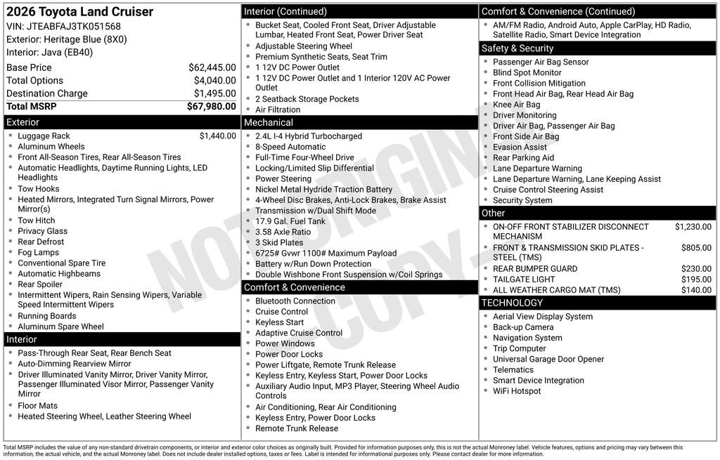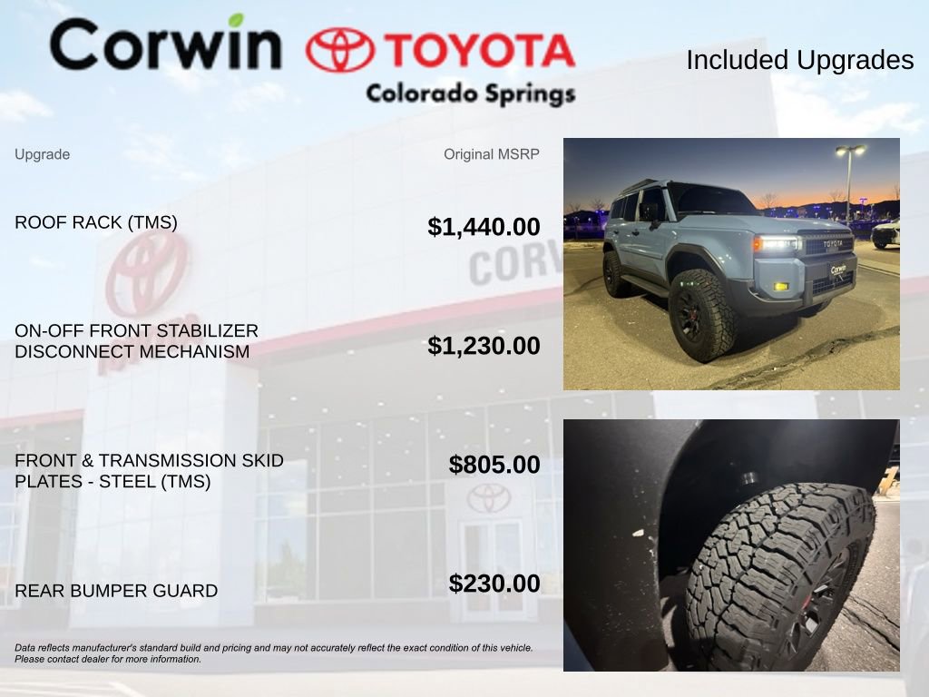 Heated and ventilated front seats, a heated steering wheel, and a premium navigation system with a 1-year trial subscription are just a few of the additional luxuries that set the Land Cruiser Base apart. Crafted with meticulous attention to detail, this vehicle's sophisticated SofTex synthetic leather upholstery and matte gray alloy wheels exude a refined, yet rugged aesthetic.