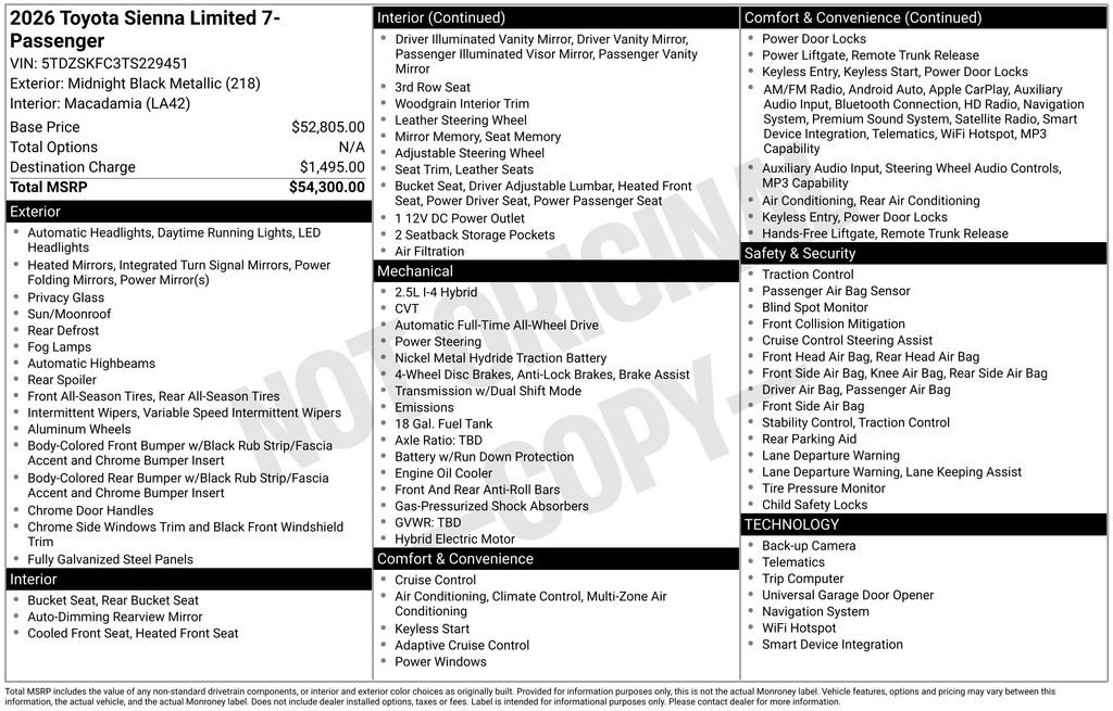 2026 Midnight Black Metallic Toyota Sienna Limited Clean CARFAX.
