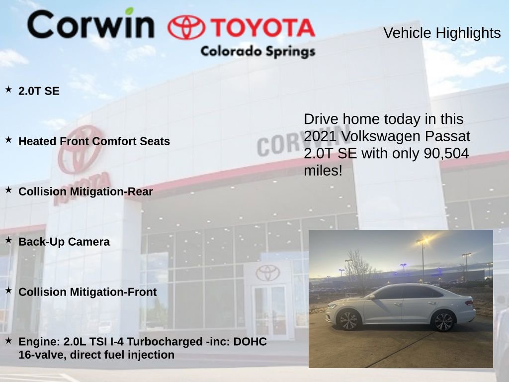 This Volkswagen Passat is well equipped and includes the following features and benefits, 2.0T SE, Heated Front Comfort Seats, Collision Mitigation-Rear, Back-Up Camera, Collision Mitigation-Front, Engine: 2.0L TSI I-4 Turbocharged -inc: DOHC 16-valve, direct fuel injection. 24/36 City/Highway MPG
