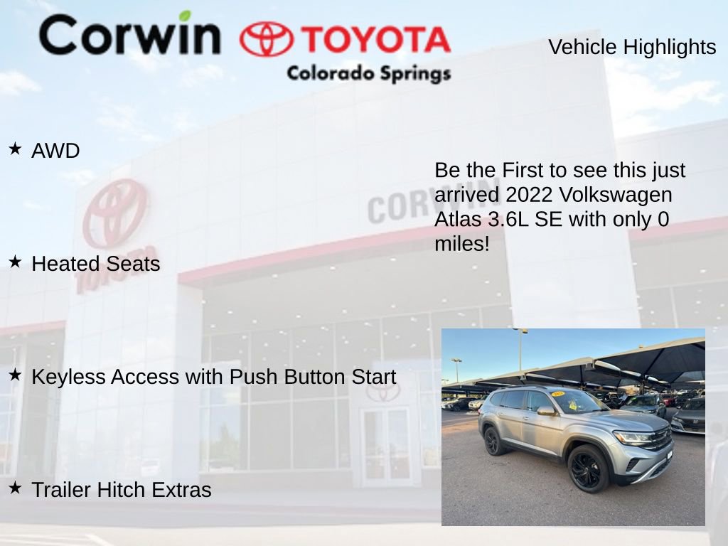 This Volkswagen Atlas is well equipped and includes the following features and benefits, AWD, Heated Seats, Keyless Access with Push Button Start, Trailer Hitch Extras.
